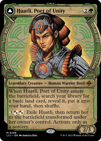 3(R/W)(R/W): Exile Huatli, then return her to the battlefield transformed under her owner's control. Activate only as a sorcery.