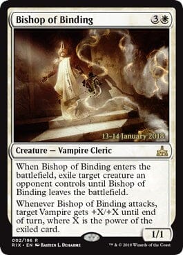 Whenever Bishop of Binding attacks, target Vampire gets +X/+X until end of turn, where X is the power of the exiled card.