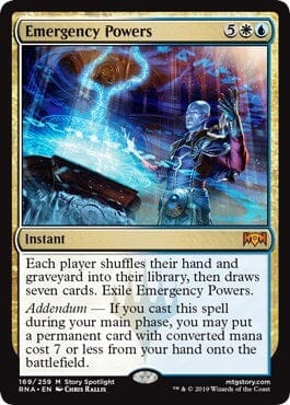 Each player shuffles their hand and graveyard into their library, then draws seven cards. Exile Emergency Powers. Addendum — If you cast this spell during your main phase, you may put a permanent card with converted mana cost 7 or less from your hand onto the battlefield.